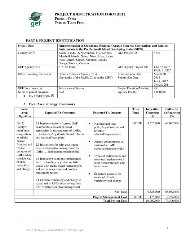 Information on the Project Identification Form - Implementation of Global and Regional Oceanic Fisheries Conventions and Related Instruments in the Pacific Small Island Developing States (SIDS)