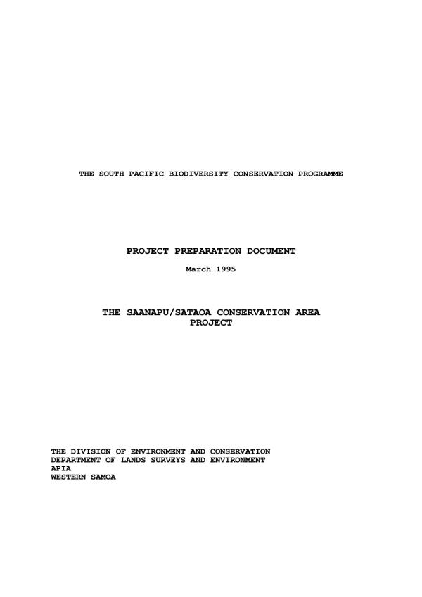 The proposed Conservation Area is centred on an area of mangrove forest (c75 hectares) in the customary ownership of Saanapu and Sataoa villages on the south coast of Upolu. This area is one of five Grade 1 sites identified by a 1991 survey of lowland ecosystems as the best remaining in Western Samoa (Park et al., 1992) . It is given priority as the best mangrove ecosystem in the country, acknowledging that mangroves have a key role to play in sustaining lagoon fisheries on which many Samoans in coastal villages depend. The two villages involved have made a commitment to conservation of this area dating back to 1992 when the results of the survey were presented to them. The project also hopes to extend conservation and sustainable development principles to other lands owned by these villages, and in the long-term to the whole Safata District.