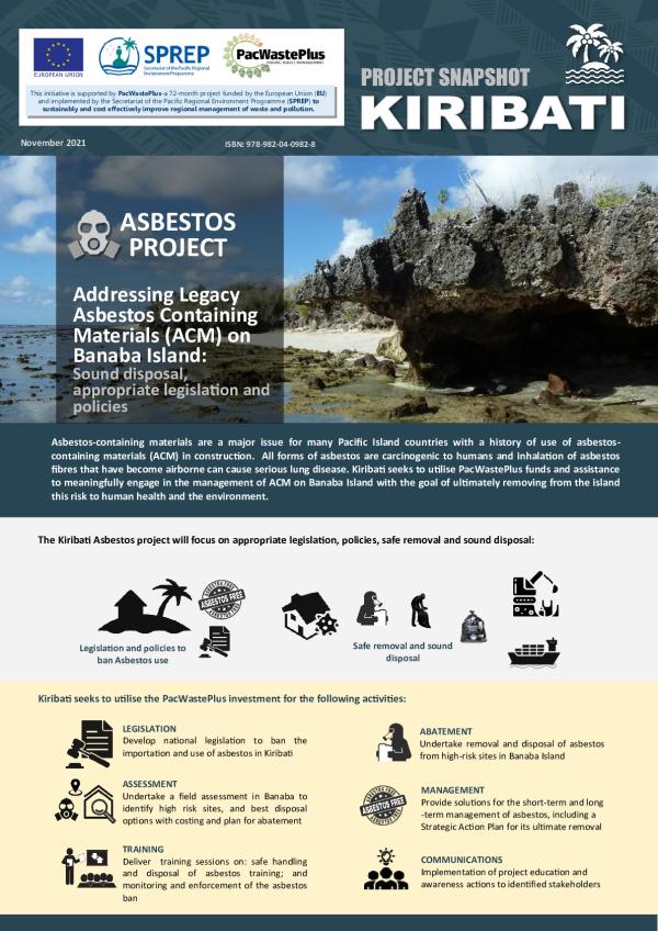 Asbestos-containing materials are a major issue for many Pacific Island countries with a history of use of asbestos-containing materials (ACM) in construction. All forms of asbestos are carcinogenic to humans and inhalation of asbestos fibres that have become airborne can cause serious lung disease. Kiribati seeks to utilise PacWastePlus funds and assistance to meaningfully engage in the management of ACM on Banaba Island with the goal of ultimately removing from the island this risk to human health and the environment.