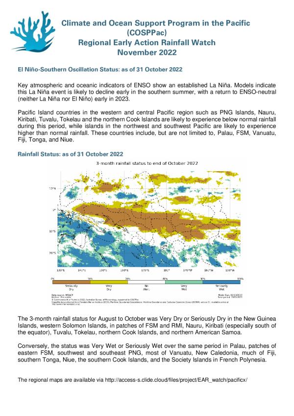 Key atmospheric and oceanic indicators of ENSO show an established La Niña. Models indicate this La Niña event is likely to decline early in the southern summer, with a return to ENSO-neutral (neither La Niña nor El Niño) early in 2023