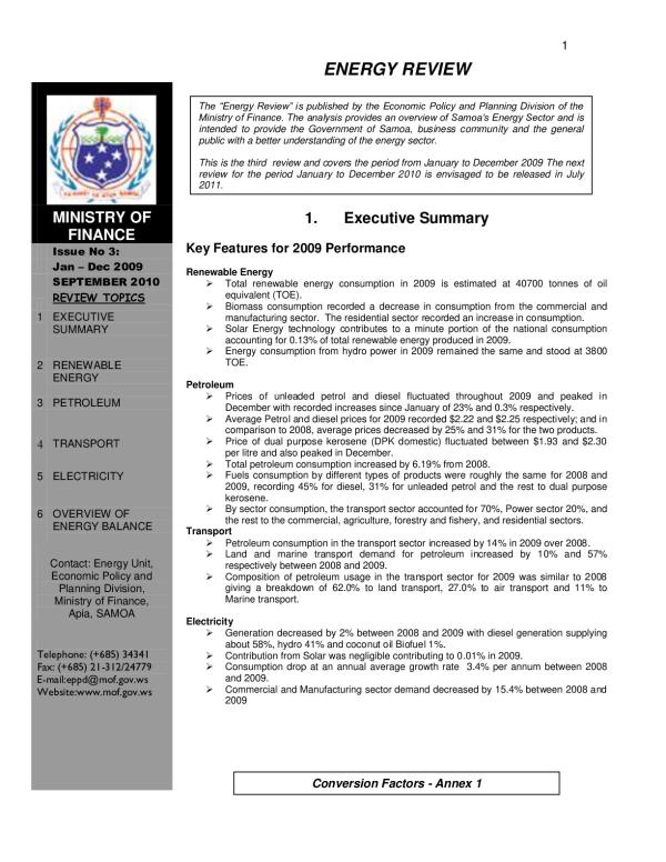 ENERGY REVIEW 1 ENERGY REVIEW 1. Executive Summary Key Features for 2009 Performance Renewable Energy ï Total renewable energy consumption in 2009 is estimated at 40700 tonnes of oil equivalent (TOE). ï Biomass consumption recorded a decrease in consumption from the commercial and manufacturing sector. The residential sector recorded an increase in consumption. ï Solar Energy technology contributes to a minute portion of the national consumption accounting for 0.13% of total renewable energy produced in 2009. ï Energy consumption from hydro power in 2009 remained the same and stood at 3800 TOE. Petroleum ï Prices of unleaded petrol and diesel fluctuated throughout 2009 and peaked in December with recorded increases since January of 23% and 0.3% respectively. ï Average Petrol and diesel prices for 2009 recorded $2.22 and $2.25 respectively; and in comparison to 2008, average prices decreased by 25% and 31% for the two products. ï Price of dual purpose