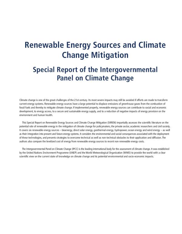 The Working Group III Special Report on Renewable Energy Sources and Climate Change Mitigation (SRREN) presents an assessment of the literature on the scientifi c, technological, environmental, economic and social aspects of the contribution of six renewable energy (RE) sources to the mitigation of climate change. It is intended to provide policy relevant information to governments, intergovernmental processes and other interested parties. This Summary for Policymakers provides an overview of the SRREN, summarizing the essential fi ndings.