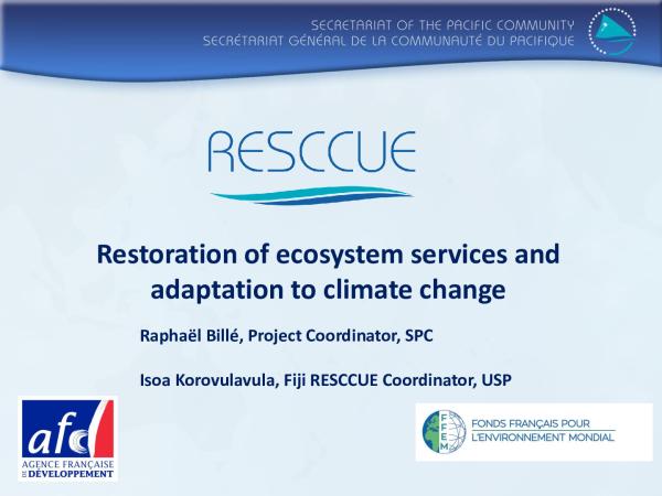 TITLE PAGERestoration of ecosystem services and adaptation to climate change Raphaël Billé, Project Coordinator, SPC Isoa Korovulavula, Fiji RESCCUE Coordinator, USP RESCCUE in brief ⢠To increase the resilience of Pacific ecosystems and societies facing impacts climate change, through strengthened and sustained integrated coastal management ⢠5 years (2014-2018) ⢠Implementing agency: SPC 4.5 2 6.8 Budget (Mâ¬) AFD FFEM OtherHow we do it Operators (Fiji, NC, FP, Van) Leader + consortium NGO, consultancies, research⦠Selection Supervision Support Reporting Calls for tenders Contracts Cofinancing // Funding 6,8 M⬠AFD FFEM 6,5 M⬠Various sources National Executing Agencies Fiji, FP, NC, Van Implementing Agency - SPC RESCCUE team Implementing agreement Opunohu North Efate Mangareva North East Coastal Zone Great South Ra Kadavu What we do together ⢠Improve coastal management ⢠Protect ecosystems from non-climate stressors (pollution, o