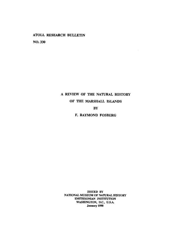 This review was prepared on very short notice, to provide a summary of what is known to the reviewer at the time, June 1988, about the natural phenomena of the Marshall Islands. This was for the use of the members of the survay team sent to the Marshalls by the Environment and Policy Institute of the East-West Center, Honolulu. Their mission was to investigate the remaining relatively natural areas and the extent of biodiversity in the new Republic of the Marshall Islands.