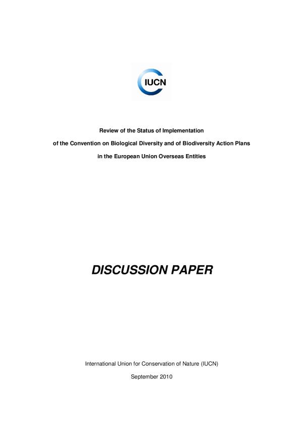 Microsoft Word - IUCN ORs OCTs CBD review discussion paper september 2010.doc Review of the Status of Implementation of the Convention on Biological Diversity and of Biodiversity Action Plans in the European Union Overseas Entities DISCUSSION PAPER International Union for Conservation of Nature (IUCN) September 2010 NOTE TO READERS AND REVIEWERS This discussion paper has been produced to provide the basis for consultation and dialogue among stakeholders concerned with biodiversity conservation and sustainable development in the overseas entities of the European Union, and with the implementation of the Convention on Biological Diversity in these entities. It contains preliminary conclusions and recommendations that are offered for review and discussion. It is a technical working document, and its contents do not necessarily reflect the policies, positions and views of IUCN or any of its Members an