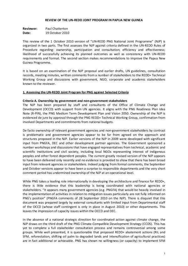This review of the 1 October 2010 version of UN-REDD PNG National Joint Programme (NJP) is organized in two parts. The first assesses the NJP against criteria defined in the UN-REDD Rules of Procedure regarding: ownership, participation and consultation; efficiency and effectiveness; likelihood of successfully achieving its planned outcomes as well as consistency with UN-REDD requirements and format. The second section makes recommendations to improve the Papua New Guinea Programme. It is based on an examination of the NJP proposal and earlier drafts, UN guidelines, consultation records, meeting minutes, written comments from a number of stakeholders to the REDD+ Technical Working Group and discussions with government, NGO, corporate and academic stakeholders known to the reviewer