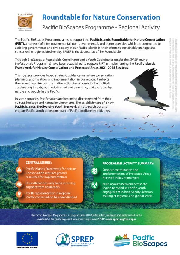 The Pacific BioScapes Programme aims to support the Pacific Islands Roundtable for Nature Conservation (PIRT), a network of inter-governmental, non-governmental, and donor agencies which are committed to assisting governments and civil society in our Pacific Islands in their efforts to sustainably manage and conserve the region's biodiversity.