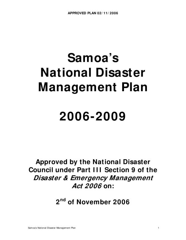 Microsoft Word - NDMP Approved 20061102APPROVED PLAN 02/11/2006 Samoaâs National Disaster Management Plan 1 Samoaâs National Disaster Management Plan 2006-2009 Approved by the National Disaster Council under Part III Section 9 of the Disaster & Emergency Management Act 2006 on: 2nd of November 2006 APPROVED PLAN 02/11/2006 Samoaâs National Disaster Management Plan 2 CONTENTS 1 Introduction ....................................................................................................... 4 1.1 Plan Purpose and Legislative Requirement ................................................ 4 1.2 Plan Development & Maintenance ............................................................ 4 1.3 Plan Context ........................................................................................... 5 1.4 Relationship with Other Plans & Legislation............................................... 5 1.5 Definitions ..............................................................