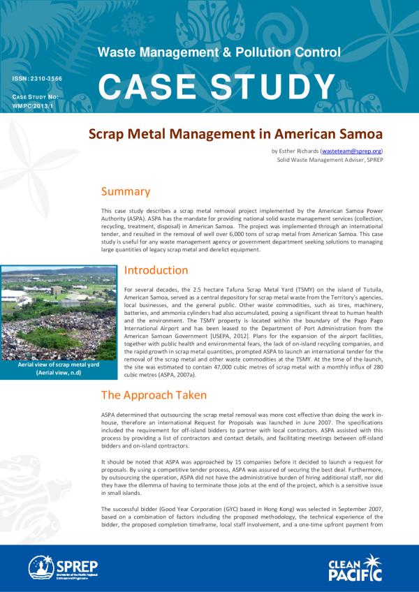 This case study describes a scrap metal removal project implemented by the American Samoa Power Authority (ASPA). ASPA has the mandate for providing national solid waste management services (collection, recycling, treatment, disposal) in American Samoa. The project was implemented through an international tender, and resulted in the removal of well over 6,000 tons of scrap metal from American Samoa. This case study is useful for any waste management agency or government department seeking solutions to managing large quantities of legacy scrap metal and derelict equipment.