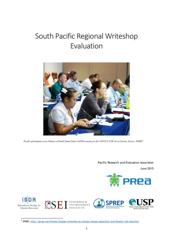 The Stockholm Environment Institute (SEI) and the International Strategy for Disaster Reduction (ISDR) collaborated with implementing partner SPREP to host a five day Writeshop (workshop) in Fiji in 2011. The Writeshop was funded by the UNITAR Climate Change Capacity and Development (C3D+) Support programme. The objective/outcomes of the Writeshop were twofold: 1. To build capacity of young Pacific country scholars, practitioners and policymakers to write quality publishable papers in the area of climate change, particularly on climate change adaptation and the linkages to disaster risk reduction. 2. To produce quality publishable papers ready for peer-review and facilitate the publication of peer-reviewed articles in academic journals to inform the policy making process on climate change. This Writeshop evaluation was informed by desktop research, an online survey and interviews with some key stakeholders. The evaluation was guided by a set of evaluation questions. · Were approximately 16 quality publishable papers published in academic journals as a result of the Writeshop? · What factors have contributed to achieving or not achieving intended outputs and outcomes of the C3D+ project? · What progress toward the outcomes has been made by the C3D+ project? Has the C3D+ partnership between UNITAR and SPREP been appropriate and effective? · To what extent have the C3D+ project outputs and assistance contributed to outcomes of the PACC programme?