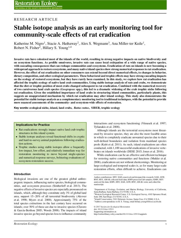 Invasive rats have colonized most of the islands of the world, resulting in strong negative impacts on native biodiversity and on ecosystem functions. As prolific omnivores, invasive rats can cause local extirpation of a wide range of native species, with cascading consequences that can reshape communities and ecosystems. Eradication of rats on islands is now becoming a widespread approach to restore ecosystems, and many native island species showstrong numerical responses to rat eradication. However, the effect of rat eradication on other consumers can extend beyond direct numerical effects, to changes in behavior, dietary composition, and other ecological parameters. These behavioral and trophic effectsmay have strong cascading impacts on the ecology of restored ecosystems, but they have rarely been examined. In this study, we explore how rat eradication has affected the trophic ecology of native land crab communities. Using stable isotope analysis of rats and crabs, we demonstrate that the diet or trophic position of most crabs changed subsequent to rat eradication. Combined with the numerical recovery of two carnivorous land crab species (Geograpsus spp.), this led to a dramatic widening of the crab trophic niche following rat eradication. Given the established importance of land crabs in structuring island communities, particularly plants, this suggests an unappreciated mechanism by which rat eradication may alter island ecology. This study also demonstrates the potential for stable isotope analysis as a complementary monitoring tool to traditional techniques, with the potential to provide more nuanced assessments of the community- and ecosystem-wide effects of restoration.