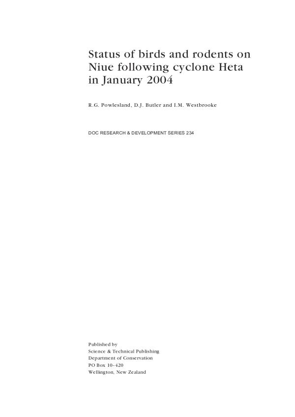 On 6 January 2004. cyclone Heta devastated much of the South Pacific island nation of Niue. Extensive damage was done to forest, particularly of the north- western sector, with many trees up-rooted and others stripped of branches and foliage. This report details our findings from a survey of Niue's birds and rodents during 3-19 September 2004 and compares these with results from a similar survey in September 1994. Five-minute bird count data, an index of conspicuousness, from three transects showed that heahea (Polynesian triller,Lalagc maculosa) were more abundant in 2004 than in 1994, but mid (Polynesian starling, Aplonis tabuensis), kulukulu (purple-crowned fruit dove. Ptilinopus porpbyraecus) and lupe (Pacific pigeon. Ducula pacifica) had declined. The 28-64% decline in the lupe population per transect w as probably primarily as a result of hunting, rather than mortality caused by cyclone Heta. Counts of birds seen per kilometre along three sections of road (lower, upper, inland) were also compared with September 1994 data. However, for various reasons we doubt that the results accurately reflect population numbers. The 212 kiu (Pacific golden plover. Pluvial is fulva) counted at sites accessible from main roads in September 2004 was similar to the 226 seen in September 1994. Rat trapping results (captures per 100 trap-nights) along the same three transects for December 1994 and September 2004 were not significantly different. Both kuma (Pacific rat. Rattus exulans) and ship rats (R. rattus) were trapped, but kuma were found only in regenerating scrub, whereas ship rats were present in both scrub and forest. Recommendations for future work are made mainly in relation to the long-term conservation of lupe, a toaga (treasured) species of Niueans.