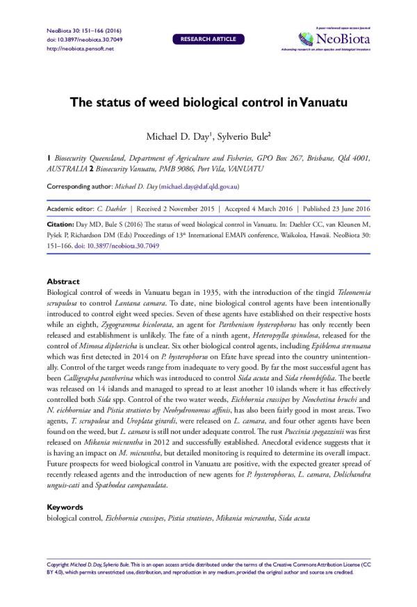 NeoBiota 30: 151166 (2016)| http://neobiota.pensoft.net| Citation: Day MD, Bule S (2016) The status of weed biological control in Vanuatu. In: Daehler CC, van Kleunen M, Pyek P, Richardson DM (Eds) Proceedings of 13th International EMAPi conference, Waikoloa, Hawaii. NeoBiota 30: 151166. doi: 10.3897/neobiota.30.7049