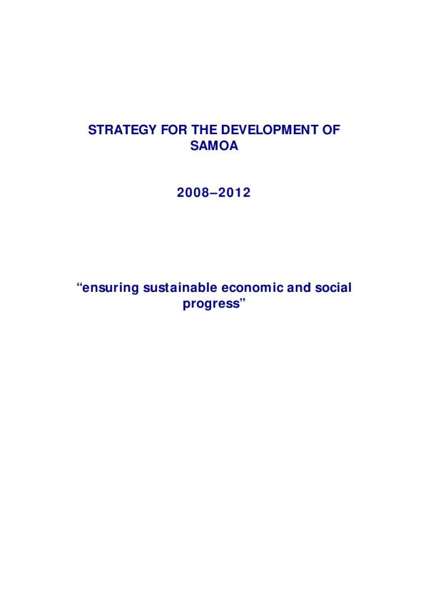In line with the requirements of the Public Finance Management Act 2001, it is a great pleasure for me to present the Strategy for the Development of Samoa (SDS), 20082012: Ensuring Sustainable Economic and Social Progress. SDS presents Samoas development vision, its medium-term national development goals, and the strategies that will be implemented during the four financial years 2008/092011/12 to achieve these goals. In comparison with previous SDS documents, the planning period has been extended by one year and aligned with the financial year to facilitate the improvement of linkages between SDS, the corporate plans of government agencies and the annual budgetary process.