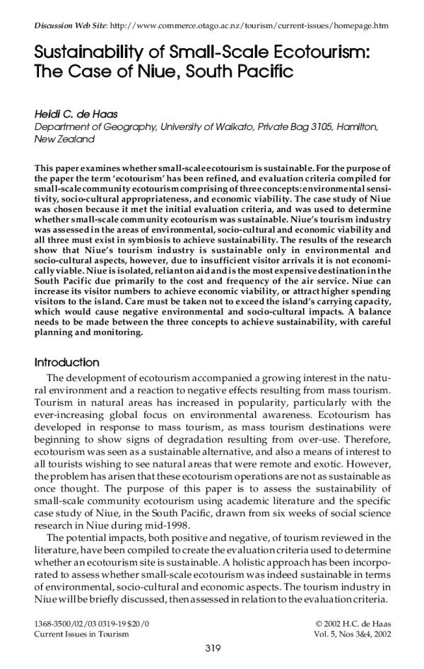 The development of ecotourism accompanied a growing interest in the natural environment and a reaction to negative effects resulting from mass tourism. Tourism in natural areas has increased in popularity, particularly with the ever-increasing global focus on environmental awareness. Ecotourism has developed in response to mass tourism, as mass tourism destinations were beginning to show signs of degradation resulting from over-use. Therefore, ecotourism was seen as a sustainable alternative, and also a means of interest to all tourists wishing to see natural areas that were remote and exotic. However, the problem has arisen that these ecotourism operations are not as sustainable as once thought. The purpose of this paper is to assess the sustainability of small-scale community ecotourism using academic literature and the specific case study of Niue, in the South Pacific, drawn from six weeks of social science research in Niue during mid-1998.