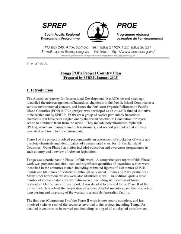 Tonga was a participant in Phase I of this work. A comprehensive report of this Phase I work was prepared and circulated, and significant quantities of hazardous wastes were identified in the countries visited, including estimated figures of 130 tonnes of PCB liquids and 60 tonnes of pesticides (although only about 3 tonnes of POPs pesticides). Many other hazardous wastes were also identified as well. In addition, quite a large number of contaminated sites were discovered, including six locations of buried pesticides. On the basis of this report, it was decided to proceed to the Phase II of the project, which involved the preparation of a more detailed inventory, and then collecting, transporting and disposing of the wastes, to a suitable Australian facility.