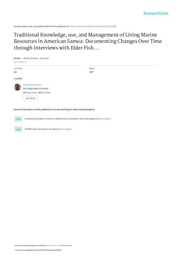 We interviewed elder fishermen in American Samoa to better under-stand their perspectives on traditional use and management of marine resources and changes in the status of certain species over the course of time.