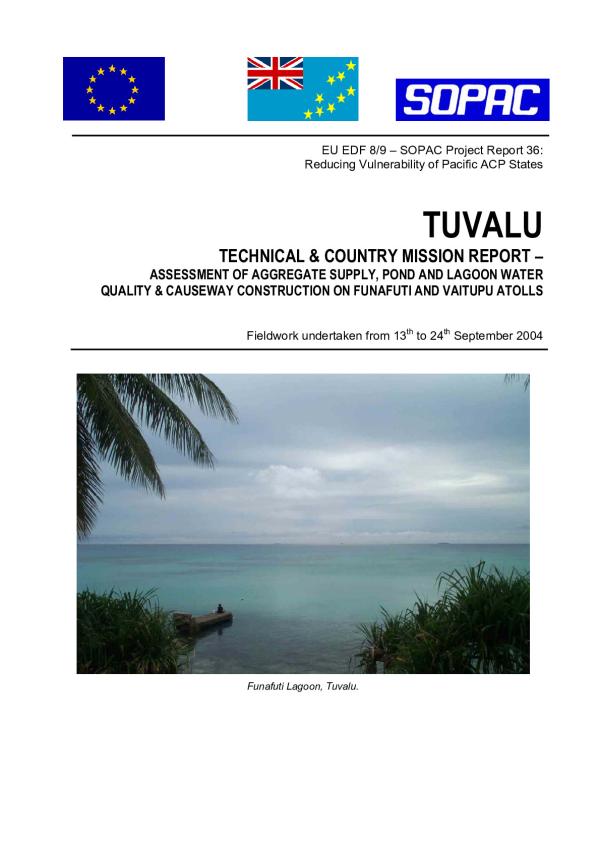 This fact finding trip was undertaken within the SOPAC/EU EDF 8/9 Reducing Vulnerability of Pacific Islands States Project. The trip was a follow up to an earlier Multi-Stakeholder Consultation meeting (29th October 2003), where the following issues pertaining to Aggregates and Coastal Processes were identified. Otherwise, the trip was initiated to meet the EDF 8/9 project tasks for Tuvalu as outlined in the Work Plan (Task No.s. TV 1.1.1; 1.1.2 and TV 1.2.4; 1.2.5; 1.2.6 [TV 3.5.2]).