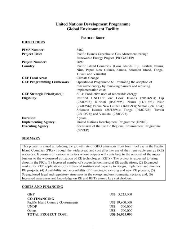 PIGGAREP Project Brief Final.doc 1 United Nations Development Programme Global Environment Facility PROJECT BRIEF IDENTIFIERS PIMS Number: 3462 Project Title: Pacific Islands Greenhouse Gas Abatement through Renewable Energy Project (PIGGAREP) Project Number: 2699 Country: Pacific Island Countries (Cook Islands, Fiji, Kiribati, Nauru, Niue, Papua New Guinea, Samoa, Solomon Island, Tonga, Tuvalu and Vanuatu) GEF Focal Area: Climate Change GEF Programming Framework: Operational Programme 6: Promoting the adoption of renewable energy by removing barriers and reducing implementation costs GEF Strategic Priority(ies): SP-4: Productive uses of renewable energy Eligibility: Ratified UNFCCC on: Cook Islands (20/04/93); Fiji (25/02/93); Kiribati (06/02/95); Nauru (11/11/93); Niue (27/02/96); Papua New Guinea (16/03/93); Samoa (29/11/94); Solomon Islands (28/12/94); Tonga (01/07/98); Tuvalu (26/10/93); and Vanuatu (25/03/93). Duration: 5 years Implementing Agency: United N