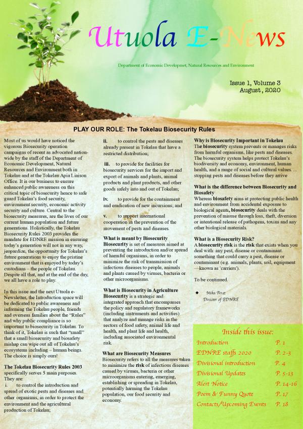 In this issue and the next Utuola e-Newsletter, the Introduction space will be dedicated to public awareness and informing the Tokelau people, friends and overseas families about the Rules and why public compliance is so important to biosecurity in Tokelau.