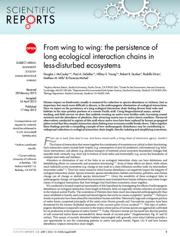 Human impact on biodiversity usually is measured by reduction in species abundance or richness. Just as important, but much more difficult to discern, is the anthropogenic elimination of ecological interactions. Here we report on the persistence of a long ecological interaction chain linking diverse food webs and habitats in the near-pristine portions of a remote Pacific atoll. Using biogeochemical assays, animal tracking, and field surveys we show that seabirds roosting on native trees fertilize soils, increasing coastal nutrients and the abundance of plankton, thus attracting manta rays to native forest coastlines. Partnered observations conducted in regions of this atoll where native trees have been replaced by human propagated palms reveal that this complex interaction chain linking trees to mantas readily breaks down. Taken together these findings provide a compelling example of how anthropogenic disturbance may be contributing to widespread reductions in ecological interaction chain length, thereby isolating and simplifying ecosystems. Record Created: 24-Apr-2018
