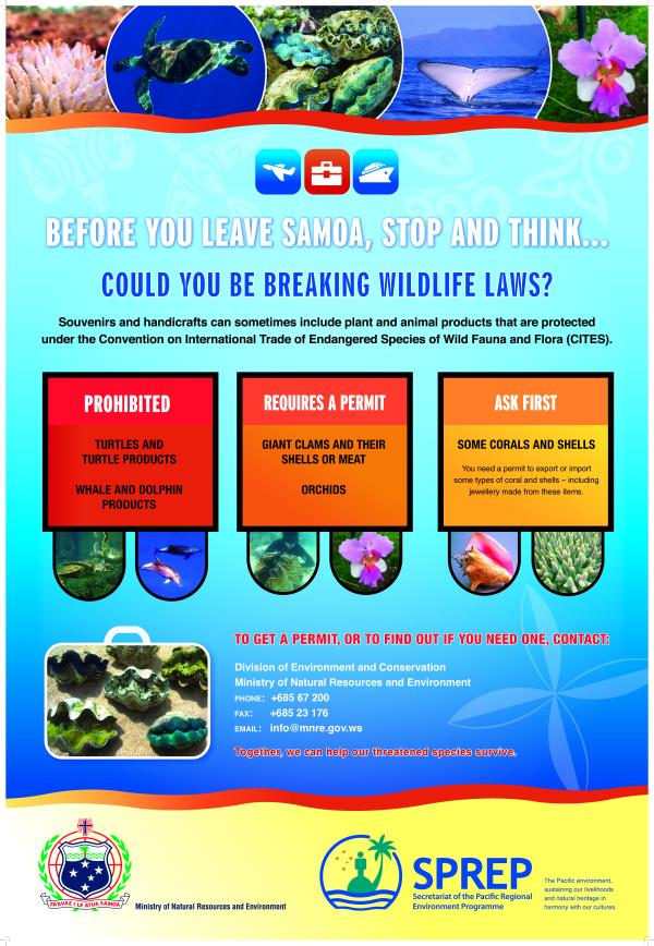 Before you leave Samoa, stop and think... Could you be breaking wildlife laws? Souvenirs and handicrafts can sometimes include plant and animal products that are protected under the Convention on International Trade of Endangered Species of Wild Fauna and Flora (CITES).