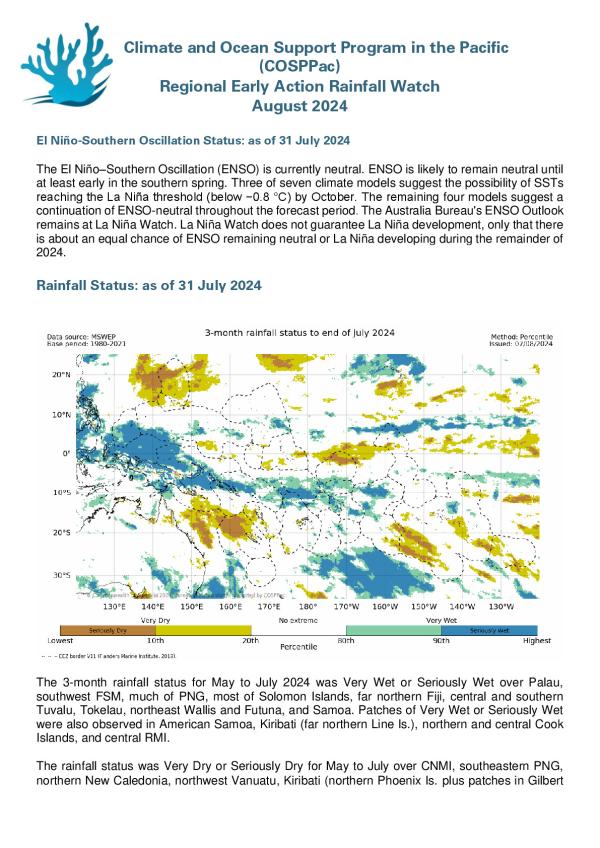 The 3-month rainfall status for May to July 2024 was Very Wet or Seriously Wet over Palau, southwest FSM, much of PNG, most of Solomon Islands, far northern Fiji, central and southern Tuvalu, Tokelau, northeast Wallis and Futuna, and Samoa. Patches of Very Wet or Seriously Wet were also observed in American Samoa, Kiribati (far northern Line Is.), northern and central Cook Islands, and central RMI.