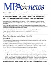 What do you know now that you wish you knew when you got started in MPAs? Insights from practitioners Much of what we learn in the MPA field and in life in general is not from formal education. It comes from learning it ourselves, or receiving advice from a colleague, or simply trial and error. This kind of knowledge is often difficult to find anywhere else. In the 18 years that MPA News has been in publication, we have asked practitioners for lessons learned, and practices developed. We have published numerous tips on how to work more efficiently or effectively. But we have not asked you for the most fundamental, essential advice you have gained from your work. We do make that request this month, and well continue to do so in future issues. We are asking practitioners: What do you know now that you wish you had known when you got started in the MPA field? Responses are below.